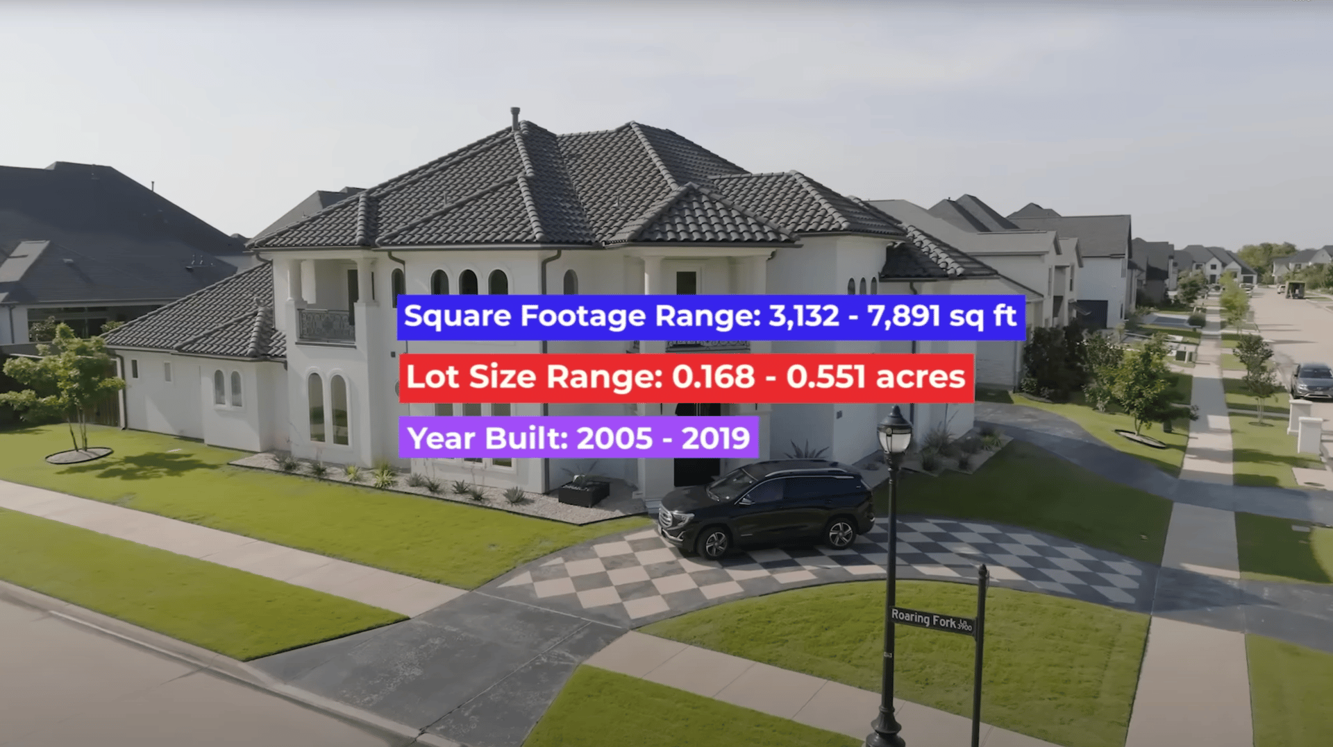 Typically 4,000–7,000+ sq ft with 4–6 bedrooms and 3-car garages.